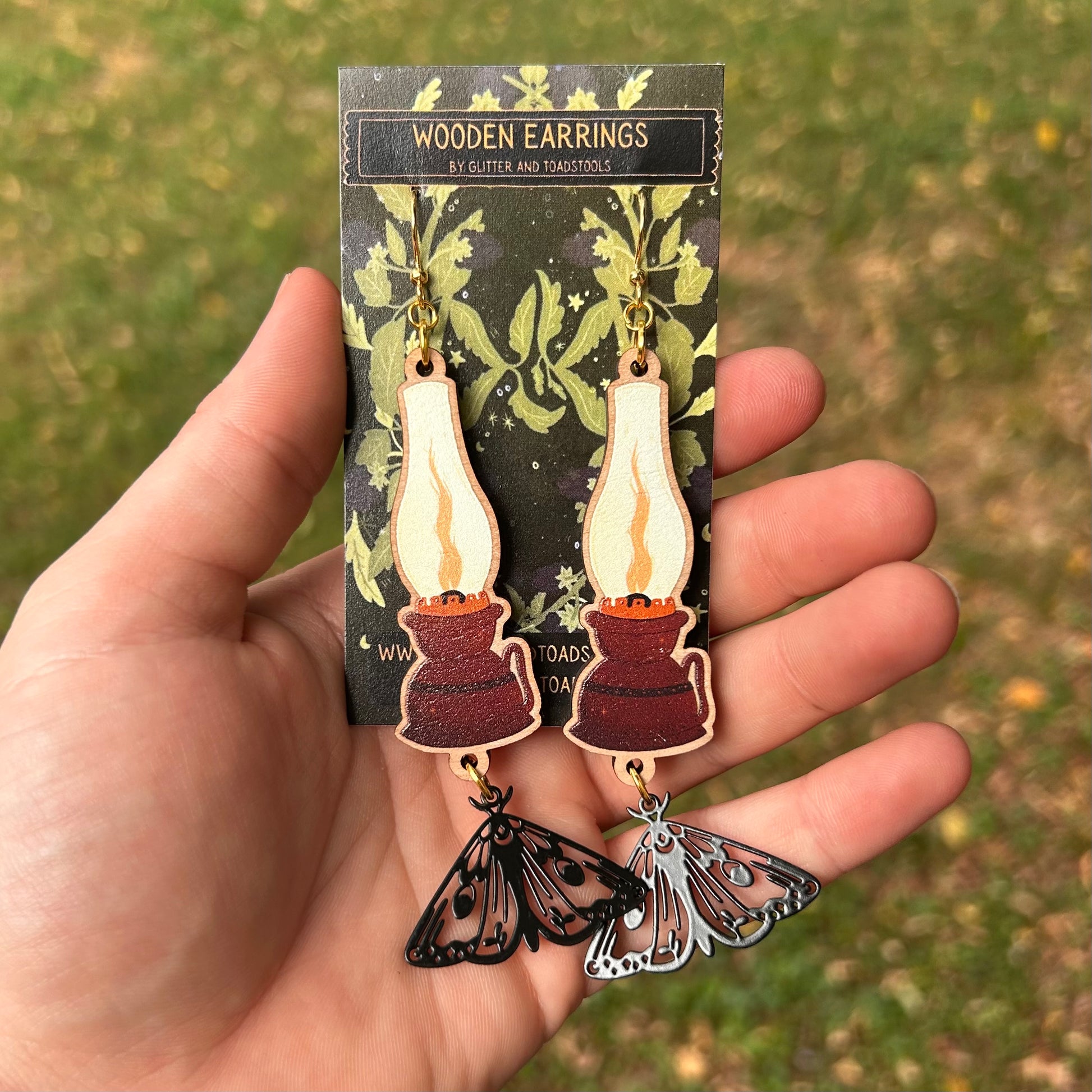 These earrings are made using responsibly-sourced cherry wood and stainless steel. Wooden charms are approximately 2" long. Art is by Hannah Mathis.